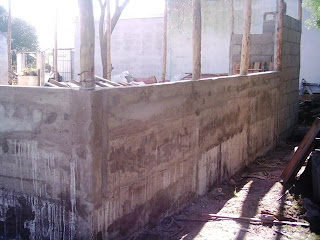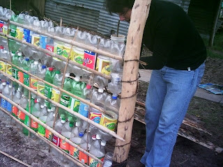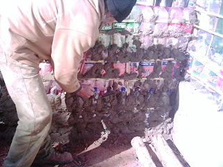Parede em construção: garrafas pet, escora de eucalipto, bambu e arame farpado.